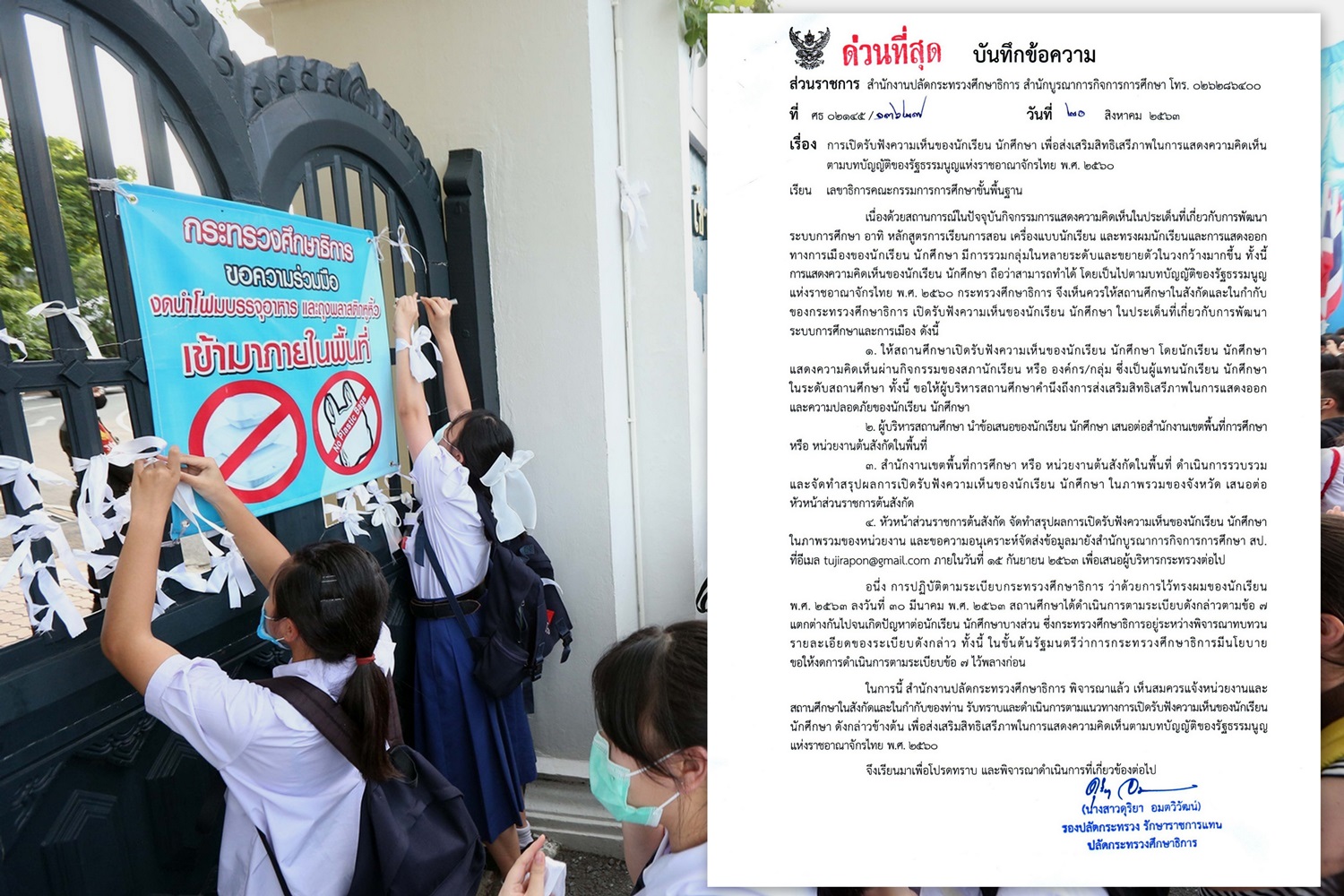 เนื่องด้วยสถานการณ์ในปัจจุบันกิจกรรมการแสดงความคิดเห็นในประเด็นที่เกี่ยวกับการพัฒนาระบบการศึกษา อาทิ หลักสูตรการเรียนการสอน เครื่องแบบนักเรียน และทรงผมนักเรียนและการแสดงออกทางการเมืองของนักเรียน นักศึกษา มีการรวมกลุ่มในหลายระดับและขยายตัวในวงกว้างมากขึ้น ทั้งนี้การแสดงความคิดเห็นของนักเรียน นักศึกษา ถือว่าสามารถทำได้ โดยเป็นไปตามบทบัญญัติของรัฐธรรมนูญฯ ศธ. จึงเห็นควรให้สถานศึกษาในสังกัดและในกำกับศธ. เปิดรับฟังความเห็นของนักเรียน นักศึกษา ในประเด็นที่เกี่ยวกับการพัฒนา ระบบการศึกษาและการเมือง ดังนี้