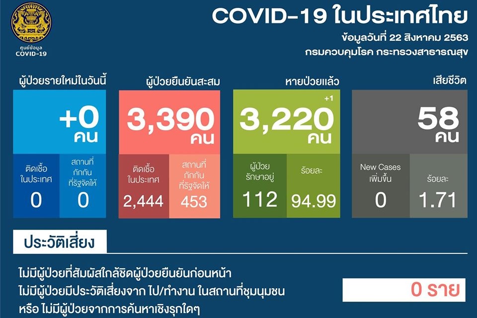ศบค.เผยวันนี้(22ส.ค.63) ไทยไม่มีผู้ติดโควิด-19ยอดสะสมหายป่วย3,220รักษาในรพ.112คน