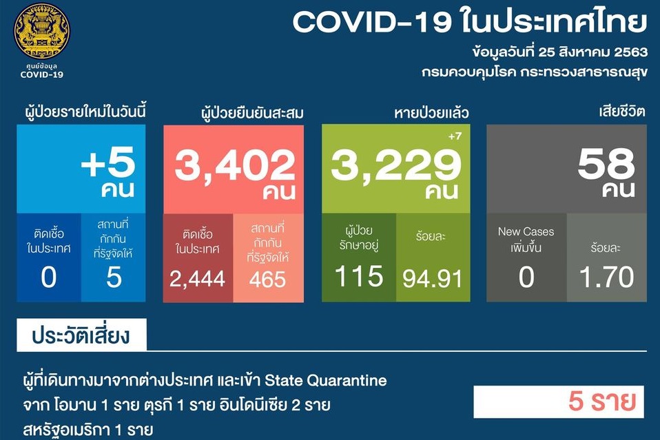 เมื่อวันที่ 25 สิงหาคม 2563 ศูนย์บริหารสถานการณ์การแพร่ระบาดของโรคติดเชื้อไวรัสโคโรนา 2019 (โควิด-19) หรือ ศบค. รายงานสถานการณ์ประจำวัน ว่า พบผู้ติดเชื้อรายใหม่ 5 ราย เป็นผู้ที่เดินทางมาจากต่างประเทศ และเข้าพักที่ State Quarantine โดยเดินทางกลับมาจากประเทศโอมาน 1 ราย , ตรุกี 1 ราย , อินโนนีเซีย 2 ราย และ สหรัฐอเมริกา 1 ราย ทำให้มียอดผู้ป่วยสะสม 3,402 ราย หายป่วยแล้วสะสม 3,229 ราย ไม่มีรายงานผู้เสียชีวิตเพิ่มเติม ทำให้ยอดสะสมคงที่ 58 ราย