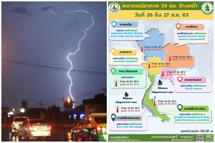กรมอุตุนิยมวิทยา พยากรณ์อากาศประจำวันที่ 26 ส.ค. 2563 ลักษณะอากาศทั่วไป พยากรณ์อากาศ 24 ชั่วโมงข้างหน้า ร่องมรสุมพาดผ่านประเทศเมียนมาและลาว เข้าสู่หย่อมความกดอากาศต่ำบริเวณประเทศเวียดนามตอนบน