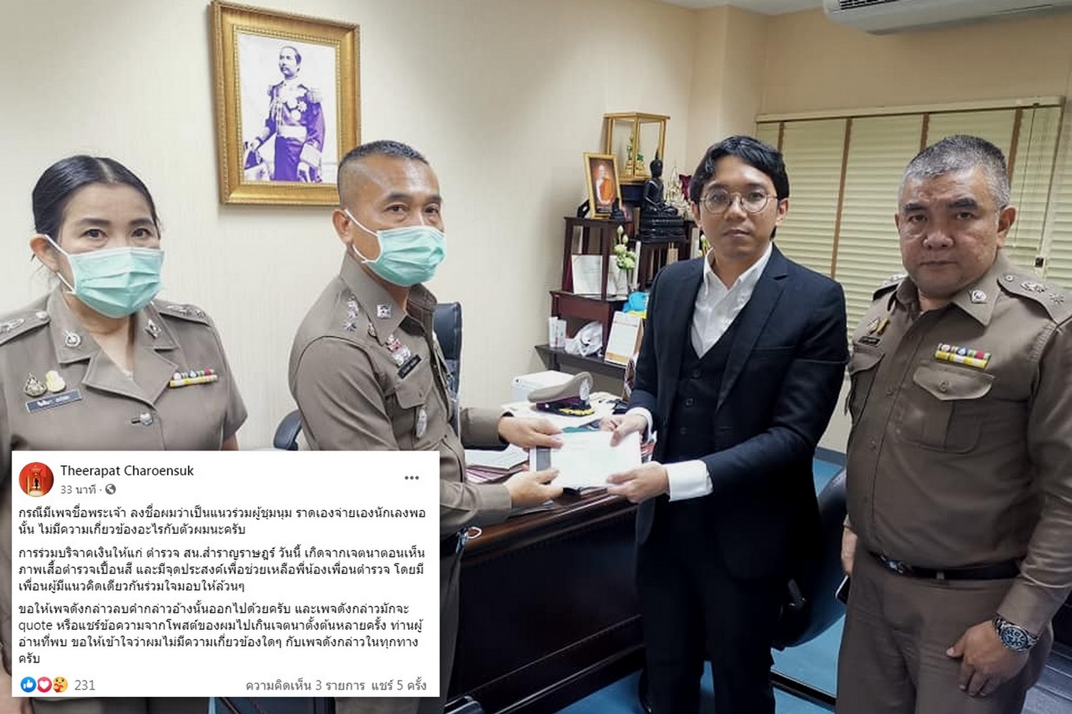 นายธีรภัทร โพสต์ข้อความเฟซบุ๊กส่วตัวว่า กรณีมีเพจชื่อพระเจ้า ลงชื่อว่าเป็นแนวร่วมผู้ชุมนุม "ราดเองจ่ายเองนักเลงพอ" ยืนยันว่าไม่มีความเกี่ยวข้องอะไรกัน การร่วมบริจาคเงินให้แก่ ตำรวจ สน.สำราญราษฎร์ เกิดจากเจตนาเพื่อช่วยเหลือพี่น้องเพื่อนตำรวจ โดยมีเพื่อนผู้มีแนวคิดเดียวกันร่วมใจมอบให้ล้วนๆ และขอให้เพจดังกล่าวลบคำกล่าวอ้างออกไป และเพจดังกล่าวมักจะ quote หรือแชร์ข้อความจากโพสต์ของผมไปเกินเจตนาตั้งต้นหลายครั้ง ท่านผู้อ่านที่พบ ขอให้เข้าใจว่าผมไม่มีความเกี่ยวข้องใดๆ กับเพจดังกล่าวในทุกทาง