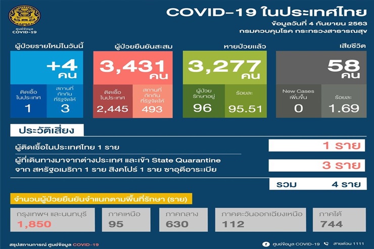 เมื่อวันที่ 4 ก.ย. 63 ศูนย์บริหารสถานการณ์โควิด-19 (ศบค.) รายงานสถานการณ์การแพร่ระบาดของไวรัสโควิด-19 ในประเทศวันนี้โดยมีเนื้อหาสรุปดังนี้