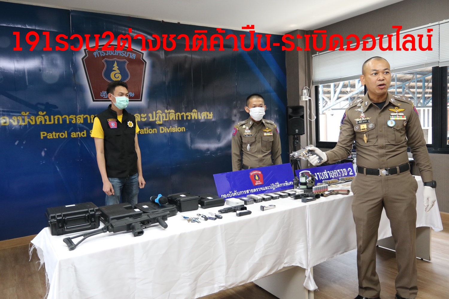 เมื่อวันที่ 4ก.ย. ที่บก.สปพ. พล.ต.ต.สำราญ นวลมา ผบก.สปพ. , พ.ต.อ.สมบูรณ์ เทียนขาว , สั่งการให้, พ.ต.อ.ปิยรัช สุภารัตน์ ผกก.สายตรวจ, พ.ต.ท.อัครพล โทยะ , พ.ต.ท.วสันต์ ธวัชชัยวิรุตษ์ รอง ผกก.สายตรวจ ร.ต.อ.คหัฐ บุตรเวียงพันธ์ รองสว.งานสายตรวจ2 กก.สายตรวจ ร่วมกันแถลงข่าวผลการจับกุมผู้ต้องหาชาวต่างชาติ 2 ราย ประกอบไปด้วย นายบิง อายุ 26 ปี ชาวสิงค์โปร์ และนายไอเดน อายุ 32 ปีชาวอินโดนีเชีย พร้อมของกลางรถยนต์ยี่ห้อเบนซ์ สีแดงพร้อมแผ่นป้ายเสียภาษีประจำปีปลอม ระบุเลขทะเบียน ฌท 2289 กทม. รถยนต์ยี่ห้อนิสสัน ทะเบียน ขย 1137 ชลบุรี อาวุธปืน จำนวน 7 กระบอก เครื่องกระสุนปืน 584 นัด ลูกระเบิดขว้างชนิดสังหารแบบ M67 จำนวน 1 ลูก,ลูกระเบิดขว้างชนิดควันสีแบบ KM18 จำนวน 1ลูก,ลูกระเบิดขว้างชนิดแสงวาบ จำนวน 2ลูก โครงปืน , สไลด์ปืน , แม็กกาซีน จำนวน 1 ชุด และแม็กกาซีนปืน 4 ชิ้น โดยจับกุมได้ที่บริเวณคอนโดแห่งหนึ่ง ย่านสุทธิสาร แขวงสามเสนนอก เขตห้วยขวาง กทม.