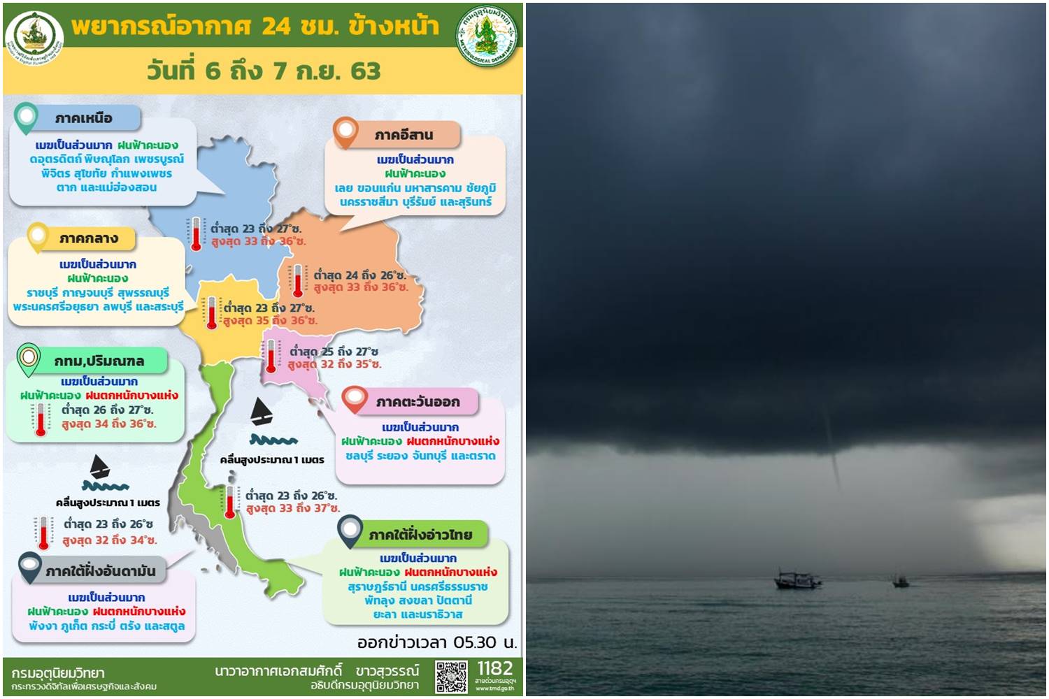 เมื่อวันที่ 6 ก.ย. 63 กรมอุตุนิยมวิทยารานงาน ลักษณะอากาศทั่วไปว่า พยากรณ์อากาศ 24 ชั่วโมงข้างหน้า ร่องมรสุมกำลังอ่อนพาดผ่านภาคเหนือ และภาคตะวันออกเฉียงเหนือตอนบน ทำให้บริเวณดังกล่าวมีฝนน้อยในระยะนี้
