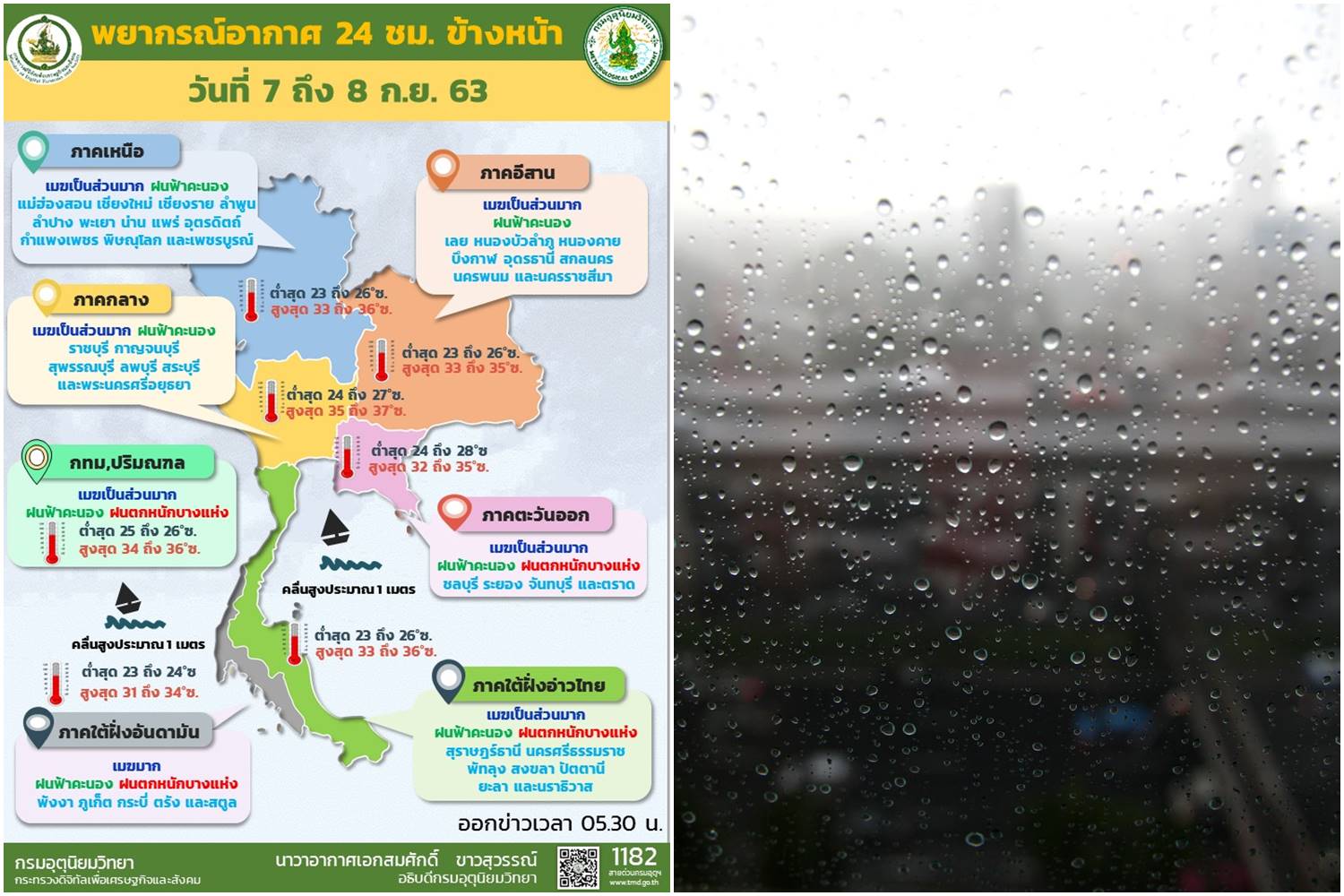 เมื่อวันที่ 7 ก.ย. 63 กรมอุตุนิยมวิทยา รายงาน ลักษณะอากาศทั่วไปว่า พยากรณ์อากาศ 24 ชั่วโมงข้างหน้า ร่องมรสุมกำลังอ่อนพาดผ่านภาคเหนือตอนบน ประเทศลาวตอนบน เข้าสู่หย่อมความกดอากาศต่ำบริเวณประเทศเวียดนามตอนบน ทำให้ประเทศไทยตอนบนมีฝนฟ้าคะนองบางพื้นที่ในระยะนี้