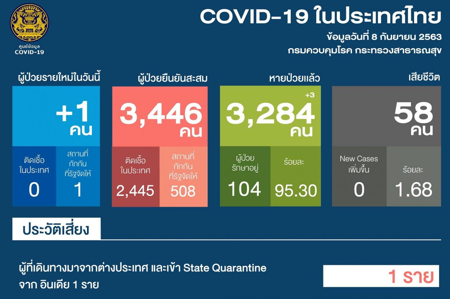 ศบค.เผยไทยพบผู้ติดเชื้อโควิดใหม่ 1 ราย เป็นชายชาวอินเดียวัย 46 ปี เดินทางมาไทยวันที่ 1 ก.ย. และเข้าพักในสถานที่กักกัน