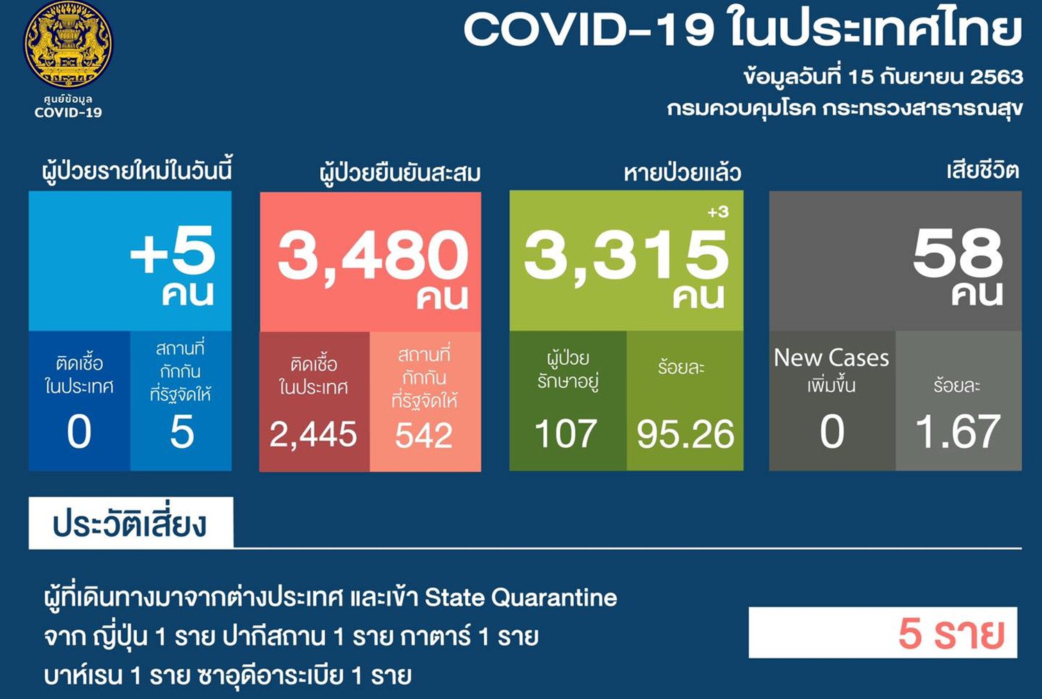 เมื่อวันที่ 15 ก.ย. 63 ศูนย์บริหารสถานการณ์โควิด-19 (ศบค.) รายงานสถานการณ์การแพร่ระบาดของไวรัสโควิด-19 ในประเทศประจำวัน โดยมีเนื้อหาสรุปดังนี้