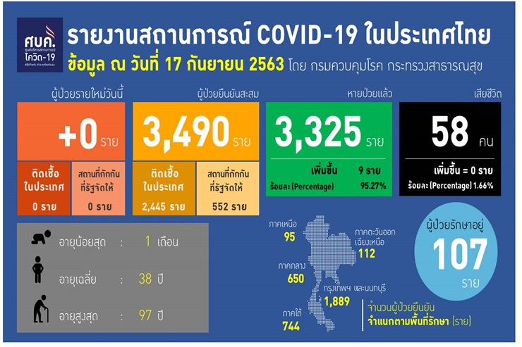 เมื่อวันที่ 17 ก.ย. 63 ศูนย์บริหารสถานการณ์โควิด-19 (ศบค.) รายงานสถานการณ์การแพร่ระบาดของไวรัสโควิด-19 ในประเทศประจำวัน โดยมีเนื้อหาสรุปดังนี้