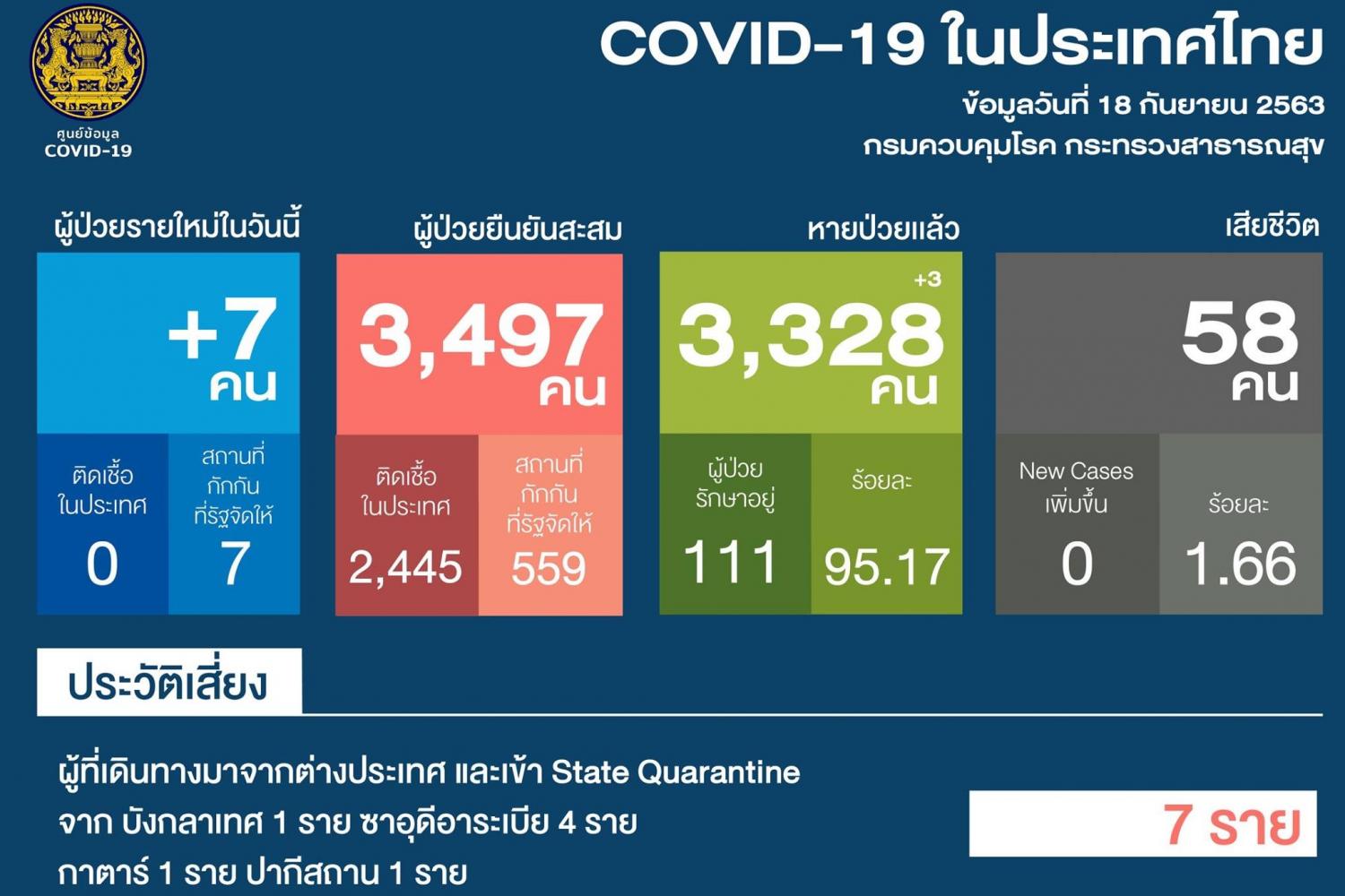 ศูนย์บริหารสถานการณ์การแพร่ระบาดของโรคติดเชื้อไวรัสโคโรนา 2019 (โควิด-19) หรือ ศบค. รายงานสถานการณ์ในประเทศไทยว่า วันนี้(18ก.ย.63) พบผู้ป่วยยืนยันติดเชื้อโควิด-19 รายใหม่ 7 ราย เดินทางมาจากต่างประเทศ(บังกลาเทศ 1 ราย, ซาอุดีอาระเบีย 4 ราย,กาตาร์ 1 ราย และปากีสถาน 1 ราย) รวมพบผู้ที่ติดเชื้อในสถานที่กักกัน 559 ราย และติดเชื้อในประเทศ 2,445 ราย