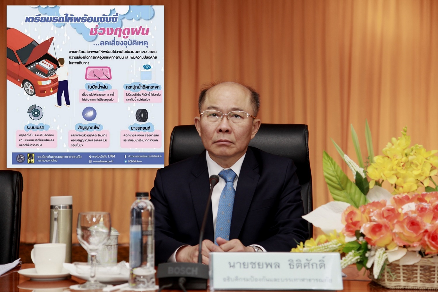 อธิบดีกรมป้องกันและบรรเทาสาธารณภัย ยังระบุอีกว่า ในช่วงที่มีฝนตกหนัก มีความเสี่ยงต่อการเกิดอุบัติเหตุทางถนนมากกว่าปกติ การเตรียม สภาพรถให้พร้อมจะช่วยให้การใช้รถใช้ถนนในช่วงฤดูฝนมีความปลอดภัยมากขึ้น กรมป้องกันและบรรเทาสาธารณภัย (ปภ.) ขอแนะการเตรียมสภาพรถให้พร้อมขับขี่ในช่วงฝนตก ดังนี้ ใบปัดน้ำฝน ใช้ยางใบปัดน้ำฝนที่มีขนาดตามมาตรฐานที่รถกำหนด กวาดน้ำได้สะอาด และไม่มีรอยขุ่นมัว รวมถึงเนื้อยางไม่แห้งกรอบ และไม่มีเสียงดังขณะใช้งาน ระบบเบรก หยุดรถได้ในระยะที่ปลอดภัย ขณะเหยียบเบรกไม่มีเสียงดัง และรถไม่มีอาการปัดหรือไถล