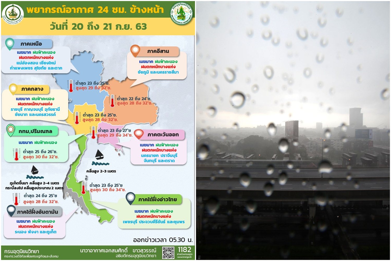 เมื่อวันที่ 20 ก.ย. 63 กรมอุตุนิยมวิทยารายงาน ลักษณะอากาศทั่วไป พยากรณ์อากาศ 24 ชั่วโมงข้างหน้า ร่องมรสุมพาดผ่านภาคเหนือตอนล่าง ภาคกลางตอนบน และภาคตะวันออกเฉียงเหนือ เข้าสู่หย่อมความกดอากาศต่ำบริเวณอ่าวตังเกี๋ย ประกอบกับมรสุมตะวันตกเฉียงใต้กำลังแรงพัดปกคลุมทะเลอันดามัน ภาคใต้ และอ่าวไทย ทำให้ประเทศไทยมีฝนตกต่อเนื่อง และมีฝนตกหนักบางแห่ง บริเวณภาคเหนือ ภาคกลาง ภาคตะวันออกเฉียงเหนือ ภาคตะวันออก และภาคใต้ตอนบน ขอให้ประชาชนที่อาศัยในพื้นที่เสี่ยงภัยบริเวณดังกล่าว ระวังอันตรายจากฝนตกหนักซึ่งอาจทำให้เกิดน้ำท่วมฉับพลันและน้ำป่าไหลหลากได้