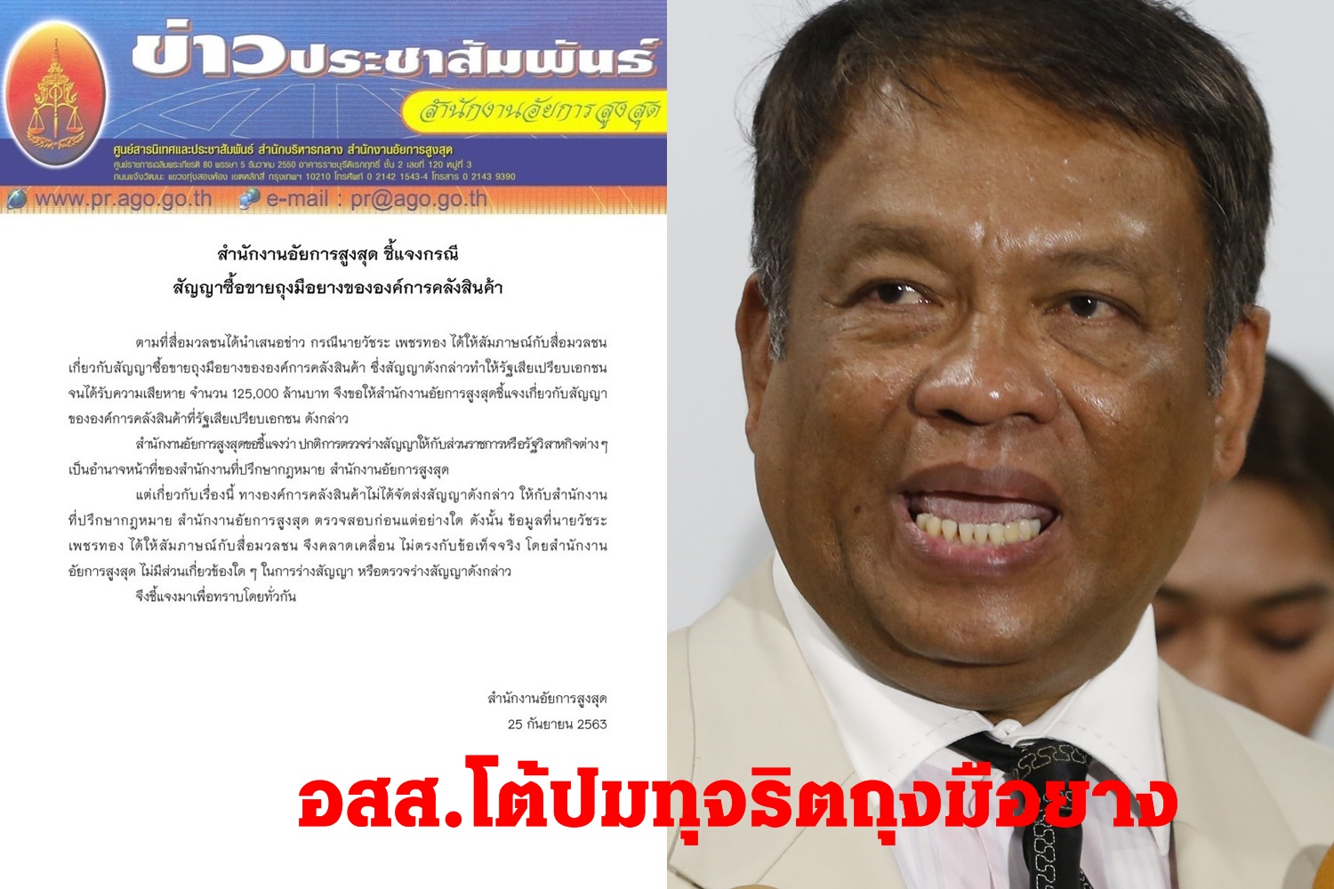 เมื่อวันที่ 25 ก.ย.63 เวลา 15.40 น. สำนักงานอัยการสูงสุด ได้ออกเอกสารข่าวเผยแพร่สื่อมวลชน ชี้แจงกรณีสัญญาซื้อขายถุงมือยางขององค์การคลังสินค้า นะบุว่า ตามที่สื่อมวลชนได้นำเสนอข่าวกรณีนายวัชระ เพชรทอง อดีตส.ส.ระบบบัญชีรายชื่อ พรรคประชาธิปัตย์ ให้สัมภาษณ์กับสื่อมวลชนเกี่ยวกับสัญญาซื้อขายถุงมือยางขององค์การคลังสินค้า (อคส.) ซึ่งสัญญาดังกล่าวทำให้รัฐเสียเปรียบเอกชนจนได้รับความเสียหายจำนวน 125,000 ล้านบาท จึงขอให้สำนักงานอัยการสูงสุดชี้แจงเกี่ยวกับสัญญาขององค์การคลังสินค้าที่รัฐเสียเปรียบเอกชนดังกล่าวนั้น