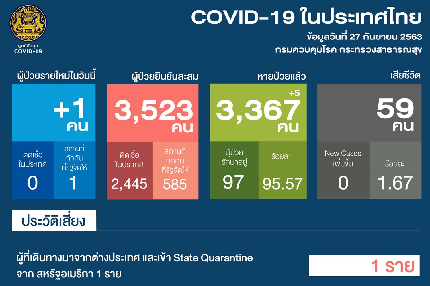 -ผู้ป่วยรายใหม่ เป็นนักศึกษาชายไทยอายุ 24 ปี เดินทางจากสหรัฐมาถึงไทยเมื่อวันที่ 22 ก.ย. เข้าพัก State Quarantine ในจังหวัดชลบุรี ตรวจหาเชื้อครั้งที่ 1 ในวันที่ 25 ก.ย. ผลตรวจพบเชื้อ ไม่มีอาการ เข้ารับการรักษา รพ.บางละมุง จ.ชลบุรี