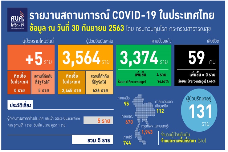 เมื่อวันที่ 30 ก.ย. 63 ศูนย์บริหารสถานการณ์โควิด-19 (ศบค.) รายงานสถานการณ์การแพร่ระบาดของไวรัสโควิด-19 ในประเทศประจำวันดังนี้