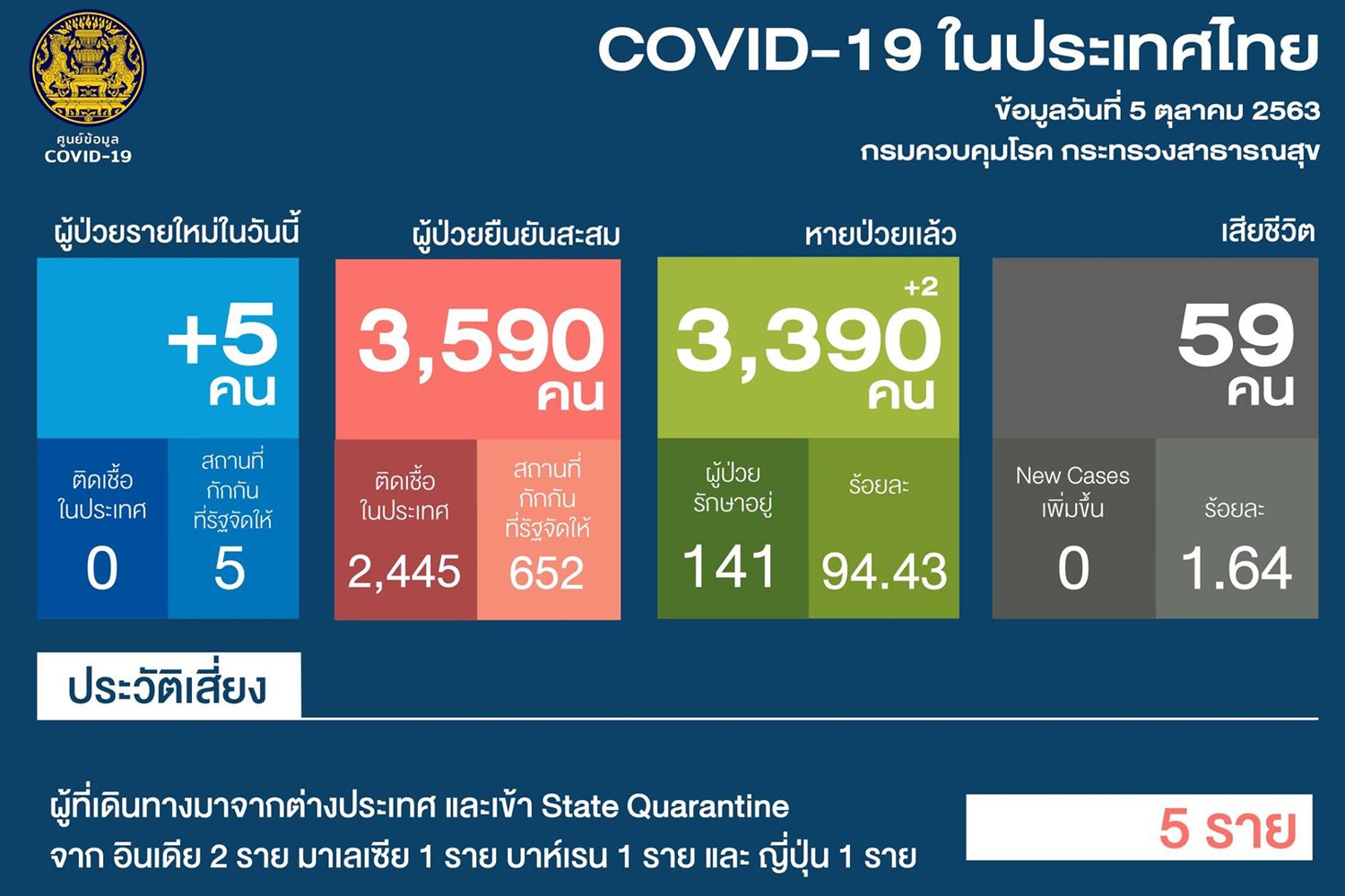 เมื่อวันที่ 5 ต.ค. 63 ศูนย์บริหารสถานการณ์โควิด-19 (ศบค.) รายงานสถานการณ์การแพร่ระบาดของไวรัสโควิด-19 ในประเทศประจำวันดังนี้