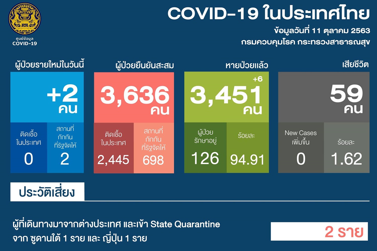 เมื่อวันที่ 11 ต.ค. 63 ศูนย์บริหารสถานการณ์โควิด-19 (ศบค.) รายงานสถานการณ์เชื้อไวรัสโควิด-19 ในประเทศไทยประจำวัน โดยมีเนื้อหาสรุปดังนี้