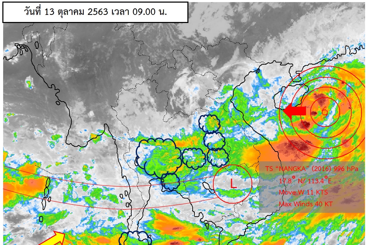 เมื่อเวลา 04.00 น. ของวันนี้ (13 ตุลาคม 2563) พายุระดับ 3 (พายุโซนร้อน) “นังกา” บริเวณทะเลจีนใต้ตอนบน มีศูนย์กลางอยู่ห่างประมาณ 290 กิโลเมตร ทางด้านตะวันออกของเกาะไหลำ ประเทศจีน หรือที่ละติจูด 18.0 องศาเหนือ ลองจิจูด 112.8 องศาตะวันออก มีความเร็วลมสูงสุดใกล้ศูนย์กลางประมาณ 75 กิโลเมตรต่อชั่วโมง กำลังเคลื่อนตัวทางทิศตะวันตกด้วยความเร็ว ประมาณ 20 กิโลเมตรต่อชั่วโมง