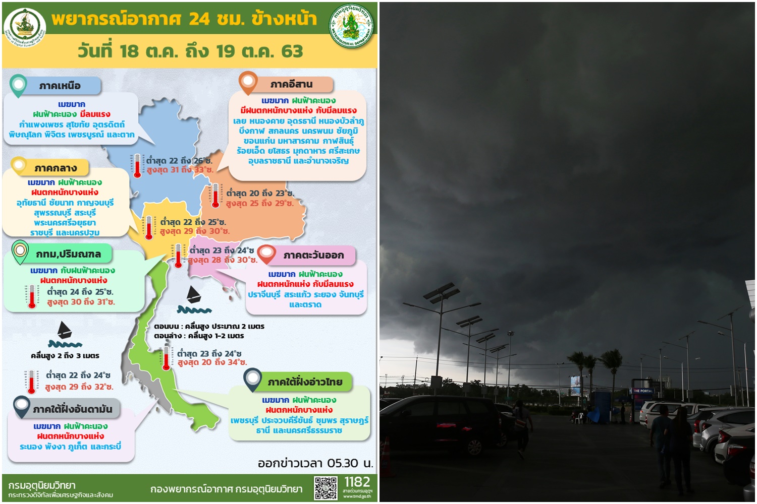 เมื่อวันที่ 18 ต.ค. 63 กรมอุตุนิยมวิทยารายงาน ลักษณะอากาศทั่วไป ดังนี้ พยากรณ์อากาศ 24 ชั่วโมงข้างหน้า ร่องมรสุมกำลังแรงพาดผ่านภาคกลางตอนล่าง ภาคใต้ตอนบน และภาคตะวันออก เข้าสู่หย่อมความกดอากาศต่ำบริเวณประเทศกัมพูชา ประกอบกับมรสุมตะวันตกเฉียงใต้ที่พัดปกคลุมทะเลอันดามัน ภาคใต้ และอ่าวไทย ยังคงมีกำลังแรง ทำให้ประเทศไทยมีฝนตกต่อเนื่อง และมีฝนตกหนักบางแห่งบริเวณภาคตะวันออกเฉียงเหนือ ภาคกลาง ภาคตะวันออก และภาคใต้ ขอให้ประชาชนบริเวณดังกล่าวระวังอันตรายจากฝนตกหนักและฝนที่ตกสะสม ซึ่งอาจทำให้เกิดน้ำท่วมฉับพลันและน้ำป่าไหลหลากได้