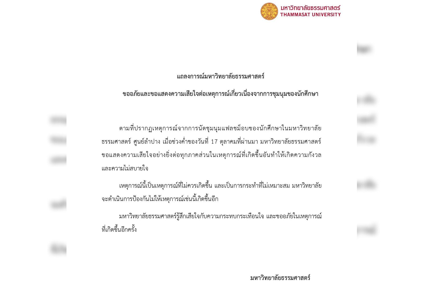 ตามที่ปรากฏเหตุการณ์จากการนัดชุมนุมแฟลชม็อบของนักศึกษาในมหาวิทยาลัยธรรมศาสตร์ ศูนย์ลำปาง เมื่อช่วงค่ำของวันที่ 17 ตุลาคมที่ผ่านมา มหาวิทยาลัยธรรมศาสตร์ขอแสดงความเสียใจอย่างยิ่งต่อทุกภาคส่วนในเหตุการณ์ที่เกิดขึ้นอันทำให้เกิดความกังวลและความไม่สบายใจ