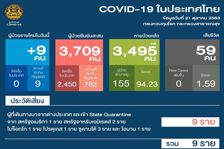 เมื่อวันที่ 21 ตค.63 ศูนย์บริหารสถานการณ์โควิด-19 (ศบค.) รายงานสถานการณ์การแพร่ระบาดของไวรัสโควิด-19 ในประเทศประจำวันดังนี้