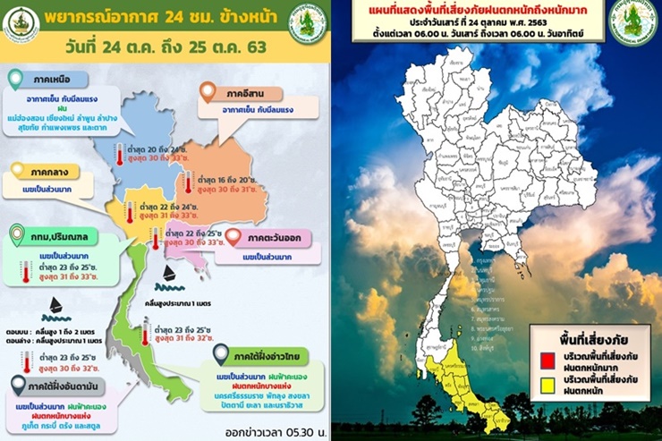 กรมอุตุนิยมวิทยา พยากรณ์อากาศประจำวันที่ 24 ตค. 2563 ลักษณะอากาศทั่วไป พยากรณ์อากาศ 24 ชั่วโมงข้างหน้า บริเวณความกดอากาศสูงจากประเทศจีนแผ่ลงมาปกคลุมภาคกลางและภาคตะวันออกแล้ว ทำให้ประเทศไทยตอนบนอุณหภูมิลดลง 1-3 องศาเซลเซียส กับมีลมแรง โดยมีฝนบางแห่ง ในบริเวณภาคเหนือ สำหรับร่องมรสุมพาดผ่านภาคใต้ตอนกลาง ประกอบกับมรสุมตะวันตกเฉียงใต้กำลังปานกลางพัดปกคลุมทะเลอันดามัน ภาคใต้และอ่าวไทยตอนล่าง ทำให้ภาคใต้มีฝนตกหนักบางแห่ง