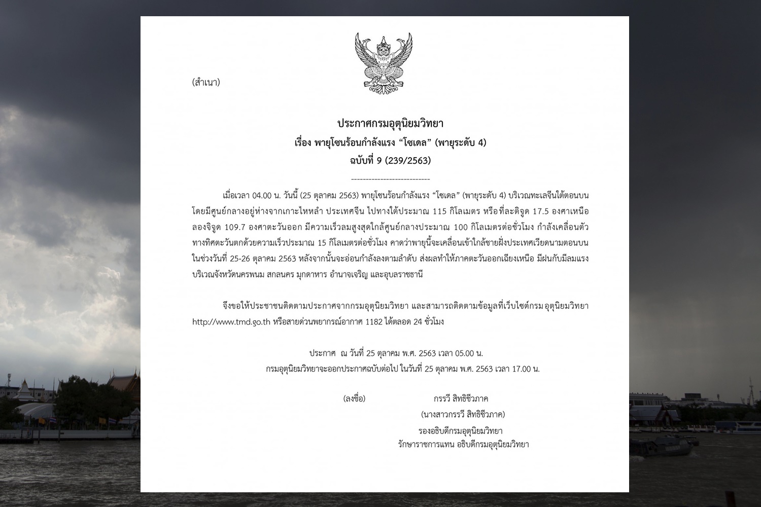 เมื่อวันที่ 25 ต.ค. 63 กรมอุตุนิยมวิทยา ออกประกาศฉบับที่ 9 เรื่อง พายุโซนร้อนกำลังแรง "โซเดล" (พายุระดับ4) ระบุว่า เมื่อเวลา 04.00 น. วันนี้ (25 ต.ค.63) พายุโซนร้อนกําลังแรง “โซเดล” (พายุระดับ 4) บริเวณทะเลจีนใต้ตอนบน โดยมีศูนย์กลางอยู่ห่างจากเกาะไหหลํา ประเทศจีน ไปทางใต้ประมาณ 115 กิโลเมตร หรือที่ละติจูด 17.5 องศาเหนือ ลองจิจูด 109.7 องศาตะวันออก