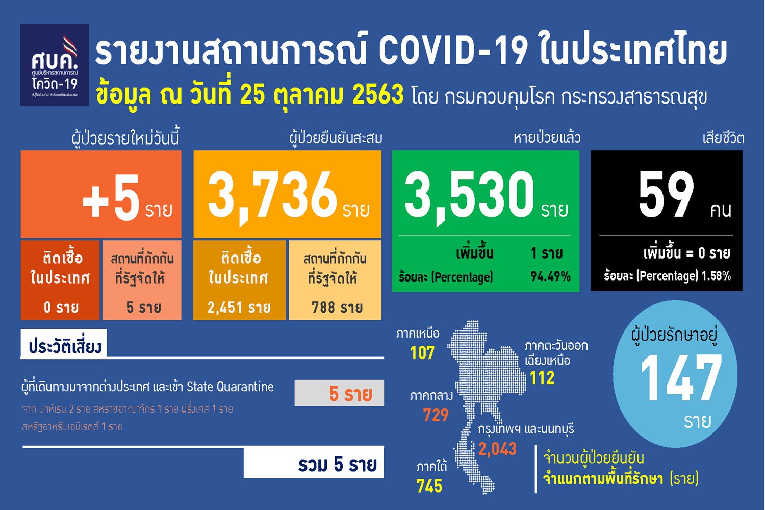 เมื่อวันที่ 25 ต.ค. 63 ศูนย์บริหารสถานการณ์ โควิด-19 (ศบค.) รายงานสถานการณ์การแพร่ระบาดของเชื้อไวรัสโควิด-19ประจำวัน โดยมีเนื้อหาสรุปดังนี้