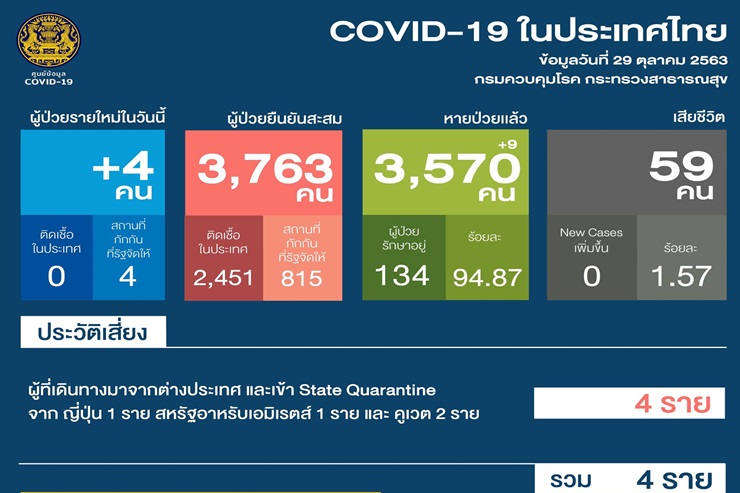 -พบผู้ป่วยยืนยันติดเชื้อรายใหม่ 4 คน เดินทางมาจากต่างประเทศ ( ญี่ปุ่น 1 ราย ,สหรัฐอาหรับเอมิเรตส์ 1 ราย และคูเวต 2 ราย ) และเข้าพักในสถานที่กักกันของรัฐ (State Quarantine)
