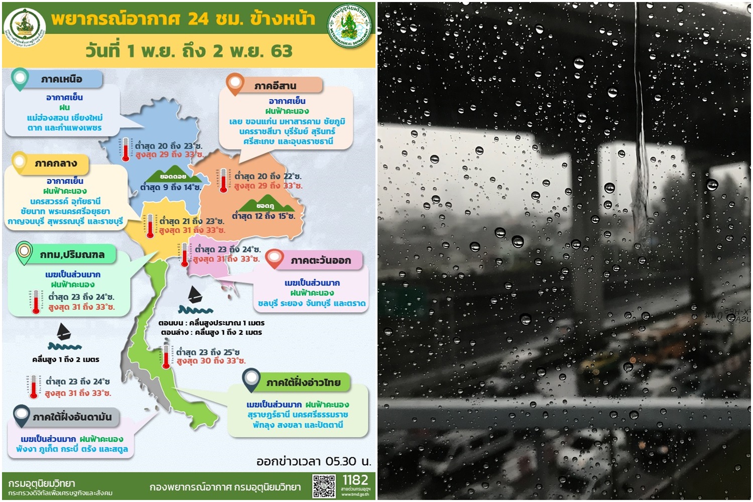 เมื่อวันที่ 1 พ.ย. 63 กรมอุตุนิยมวิทยารายงานลักษณะอากาศทั่วไปว่า พยากรณ์อากาศ 24 ชั่วโมงข้างหน้า บริเวณความกดอากาศสูงหรือมวลอากาศเย็นจากประเทศจีนปกคลุมภาคเหนือตอนบน และภาคตะวันออกเฉียงเหนือ ลักษณะเช่นนี้ทำให้บริเวณดังกล่าวมีอากาศเย็น โดยมีฝนฟ้าคะนองบริเวณประเทศไทยตอนบน ขอให้ประชาชนบริเวณภาคเหนือ และภาคตะวันออกเฉียงเหนือดูแลสุขภาพเนื่องจากสภาพอากาศที่เปลี่ยนแปลงไว้ด้วย