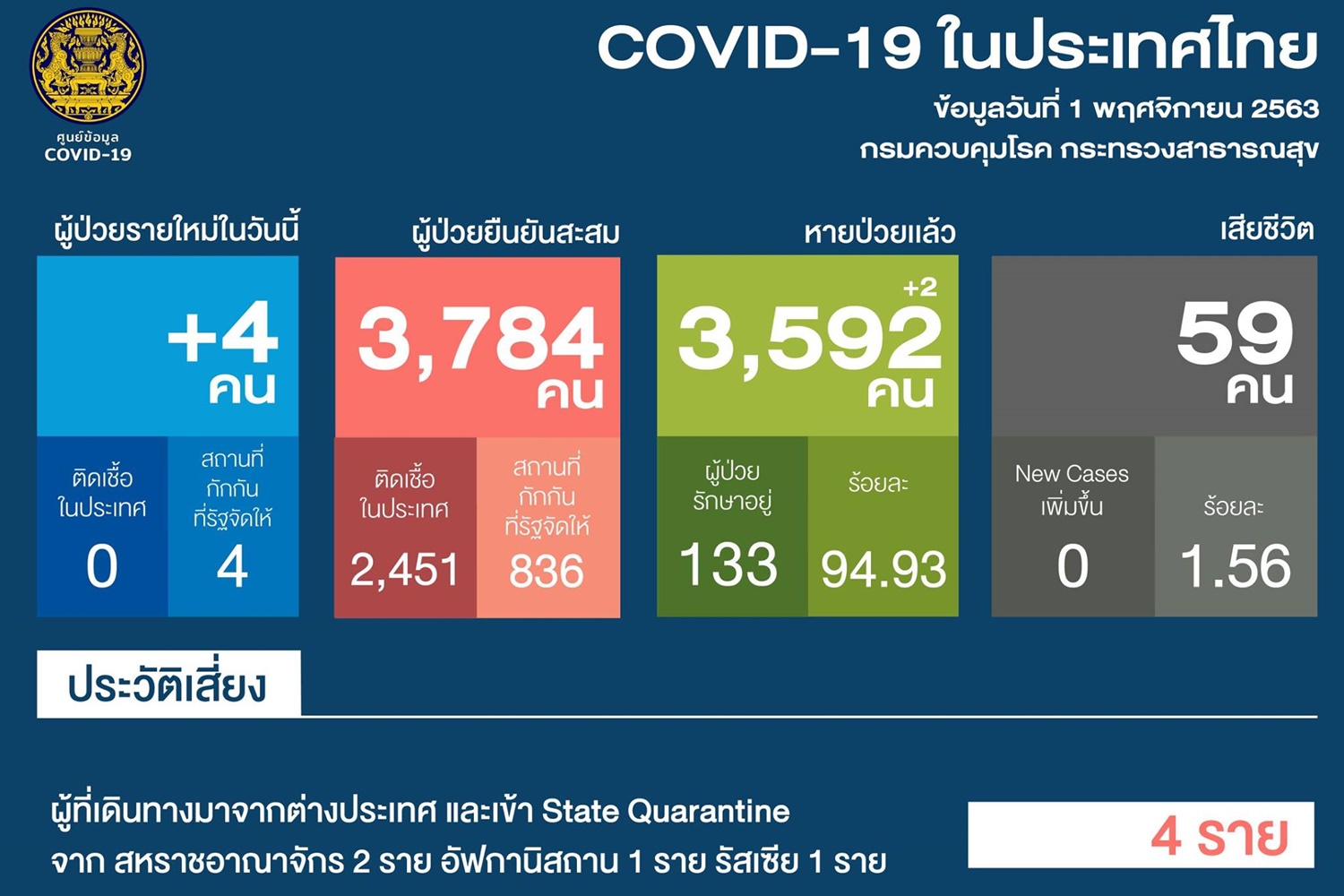 -รายที่สี่เดินทางมาจากรัสเซีย เป็นชายสัญชาติรัสเซีย อายุ 41 ปี อาชีพนักธุรกิจ เดินทางมาถึงไทยเมื่อวันที่ 26 ต.ค.63 เข้าพัก ASQ ใน กทม.เคยมีประวัติติดเชื้อ ผลตรวจครั้งแรกในวันที่สองเมื่อวันที่ 28 ต.ค.63 พบเชื้อแต่ไม่มีอาการ เข้ารับการรักษาที่ รพ.เอกชน