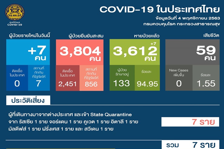 เมื่อวันที่ 4 พย.63 ศูนย์บริหารสถานการณ์โควิด-19 (ศบค.) รายงานสถานการณ์การแพร่ระบาดของไวรัสโควิด-19 ในประเทศประจำวันดังนี้