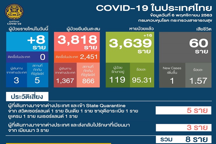 ศบค.เผยพบผู้ป่วยติดเชื้อโควิดรายใหม่ 8 คน เดินทางมาจากต่างประเทศรวมสะสม 3,818 ราย มีผู้เสียชีวิตเพิ่มอีก 1 ราย รวม 60 ราย