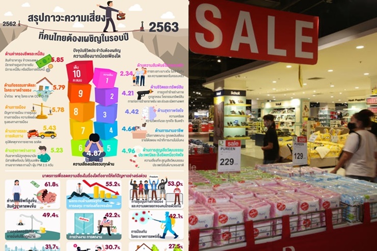 โดยด้านที่คนไทยมีความเสี่ยงมากที่สุดคือ ด้านค่าครองชีพและหนี้สิน ได้ค่าเฉลี่ย 5.85 คะแนน รองลงมาคือ ด้านภัยธรรมชาติและโรคระบาดร้ายแรง ได้ค่าเฉลี่ย 5.79 คะแนน ด้านการเมือง ได้ค่าเฉลี่ย 5.78 คะแนน ด้านการจราจรและการเดินทาง ได้ค่าเฉลี่ย 5.43 คะแนน และด้านสุขภาพร่างกาย ได้ค่าเฉลี่ยเท่ากับ 5.23 คะแนน