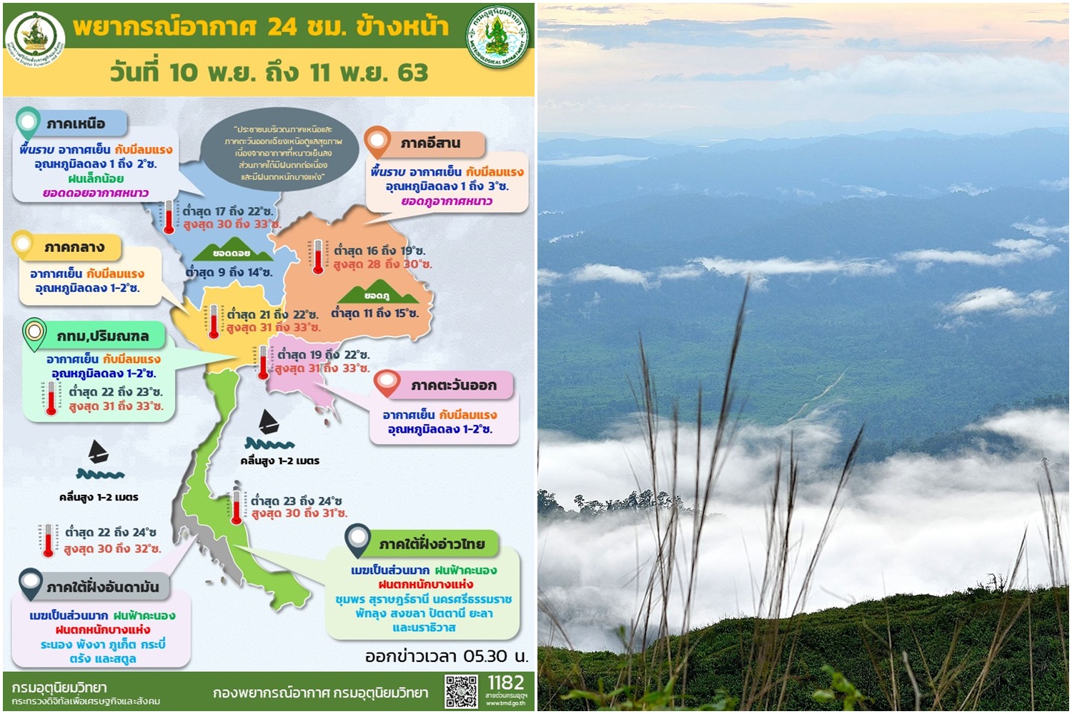 เมื่อวันที่ 10 พ.ย. 63 กรมอุตุนิยมวิทยารายงาน ลักษณะอากาศทั่วไปว่า พยากรณ์อากาศ 24 ชั่วโมงข้างหน้า บริเวณความกดอากาศสูงหรือมวลอากาศเย็นกำลังค่อนข้างแรงอีกระลอกจากประเทศจีนได้แผ่ลงมา ปกคลุมประเทศไทยตอนบน ลักษณะเช่นนี้ทำให้บริเวณดังกล่าวอุณหภูมิจะลดลงอีก 1-3 องศาเซลเซียส กับมีอากาศเย็นและมีลมแรง ส่วนบริเวณยอดดอยและยอดภู มีอากาศหนาว ขอให้ประชาชนบริเวณภาคเหนือและภาคตะวันออกเฉียงเหนือดูแลสุขภาพเนื่องจากอากาศที่หนาวเย็นลงไว้ด้วย