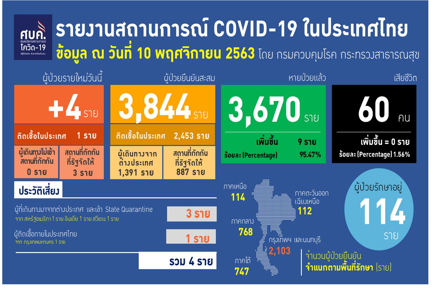 เมื่อวันที่ 10 พ.ย. 63 ศูนย์บริหารสถานการณ์โควิด-19 (ศบค.) รายงานสถานการณ์การแพร่ระบาดของไวรัสโควิด-19 ในประเทศประจำวันดังนี้