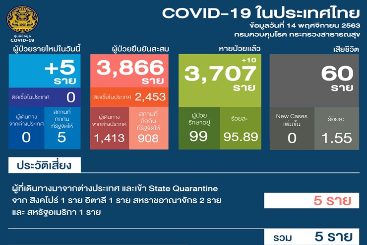 เมื่อวันที่ 14 พ.ย. 63 ศูนย์บริหารสถานการณ์โควิด-19 (ศบค.) รายงานสถานการณ์การแพร่ระบาดของไวรัสโควิด-19 ในประเทศประจำวันดังนี้