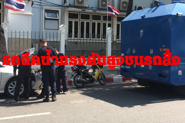 รถฉีดน้ำแรงดันสูงชนรถสื่อขณะจอดรปภ.ทำเนียบรัฐบาล