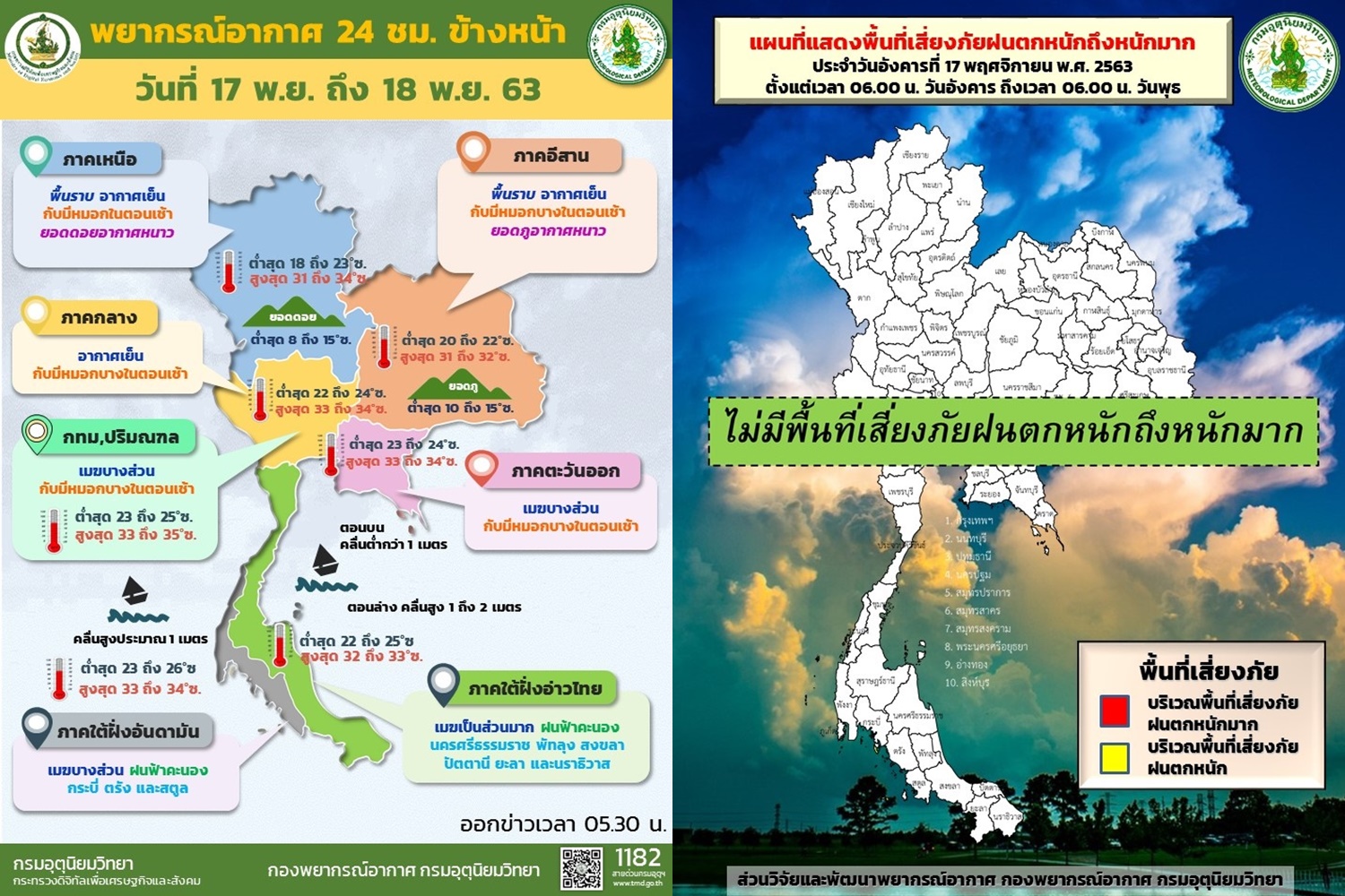 กรมอุตุนิยมวิทยา รายงาน ลักษณะอากาศทั่วไป ประจำวันที่ 17 พฤศจิกายน 2563พยากรณ์อากาศ 24 ชั่วโมงข้างหน้า บริเวณความกดอากาศสูงหรือมวลอากาศเย็นกำลังอ่อนปกคลุมประเทศไทยตอนบน ทำให้ประเทศไทยตอนบนมีอุณหภูมิสูงขึ้นเล็กน้อย แต่ยังคงมีอากาศเย็นกับมีหมอกในตอนเช้า ส่วนยอดดอยและยอดภูยังคงมีอากาศหนาว