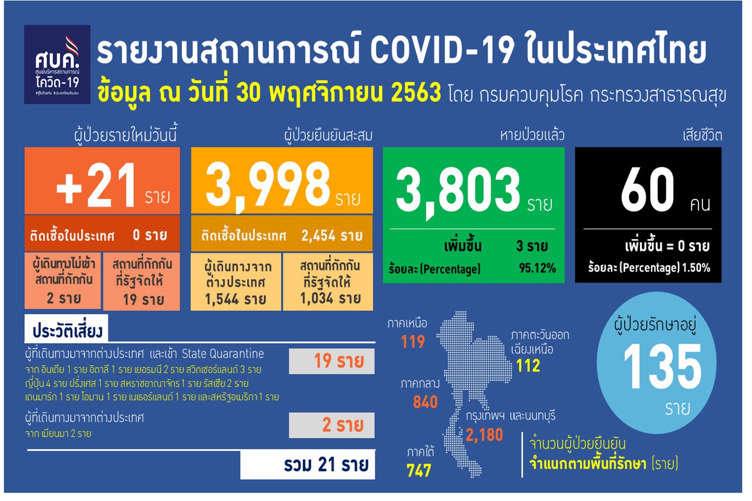 เมื่อวันที่ 30 พ.ย. 63 ศูนย์บริหารสถานการณ์โควิด-19 (ศบค.) รายงานสถานการณ์การแพร่ระบาดของไวรัสโควิด-19 ในประเทศประจำวัน ดังนี้