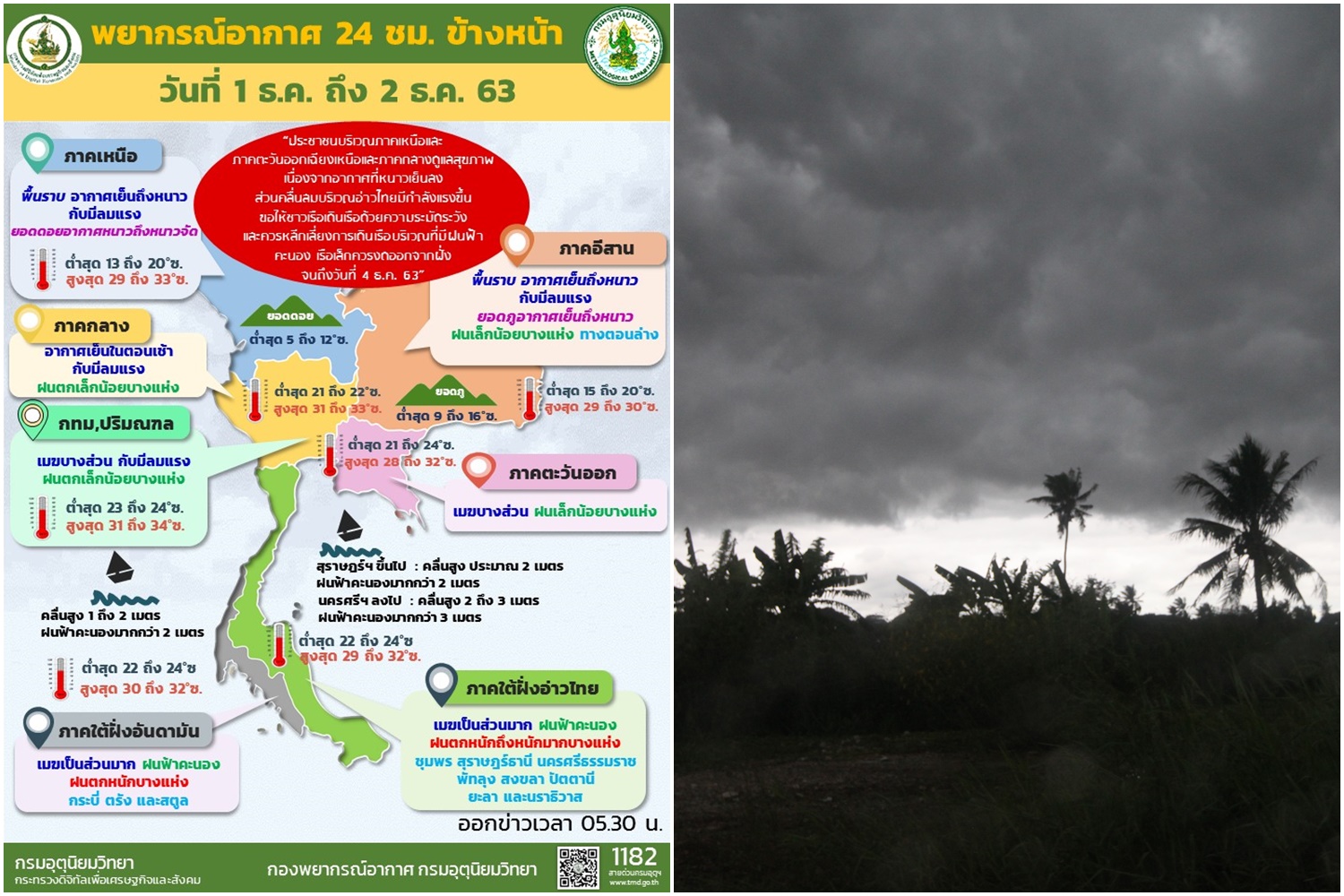 เมื่อวันที่ 1 ธ.ค. 63 กรมอุตุนิยมวิทยารายงาน ลักษณะอากาศทั่วไปว่า พยากรณ์อากาศ 24 ชั่วโมงข้างหน้า บริเวณความกดอากาศสูงหรือมวลอากาศเย็นกำลังค่อนข้างแรงยังคงแผ่ลงมาปกคลุมประเทศไทยตอนบนและทะเลจีนใต้ ทำให้บริเวณดังกล่าวมีอากาศเย็นถึงหนาวกับมีลมแรง ส่วนยอดดอยและยอดภูมีอากาศหนาวถึงหนาวจัด ขอให้ประชาชนบริเวณภาคเหนือ ภาคตะวันออกเฉียงเหนือ และภาคกลางดูแลสุขภาพเนื่องจากสภาพอากาศที่หนาวเย็นลงไว้ด้วย