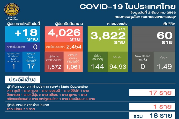 เมื่อวันที่ 2ธ.ค.63 ศูนย์บริหารสถานการณ์โควิด-19 (ศบค.) รายงานสถานการณ์การแพร่ระบาดของไวรัสโควิด-19 ในประเทศประจำวัน ดังนี้