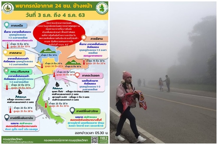 กรมอุตุนิยมวิทยาพยากรณ์อากาศประจำวันที่ 3 ธ.ค. 2563 ลักษณะอากาศทั่วไป พยากรณ์อากาศ 24 ชั่วโมงข้างหน้า บริเวณความกดอากาศสูงหรือมวลอากาศเย็นกำลังค่อนข้างแรงจากประเทศจีนอีกระลอกหนึ่งได้แผ่เสริมลงมาปกคลุมประเทศจีนตอนใต้และประเทศเวียดนามตอนบนแล้ว คาดว่าจะแผ่ลงมาปกคลุมประเทศไทยตอนบนวันพรุ่งนี้ (4 ธ.ค. 2563) ลักษณะเช่นนี้ ทำให้ประเทศไทยตอนบนมีอากาศเย็นถึงหนาว กับมีลมแรง และอุณหภูมิจะลดลง 1-3 องศาเซลเซียส ส่วนยอดดอยและยอดภูมีอากาศหนาวถึงหนาวจัด ขอให้ประชาชนบริเวณประเทศไทยตอนบน ดูแลสุขภาพเนื่องจากสภาพอากาศที่หนาวเย็นลงไว้ด้วย