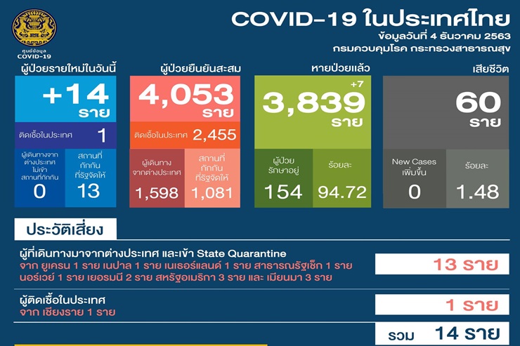 เมื่อวันที่ 4 ธ.ค.63 ศูนย์บริหารสถานการณ์โควิด-19 (ศบค.) รายงานสถานการณ์การแพร่ระบาดของไวรัสโควิด-19 ในประเทศประจำวัน ดังนี้