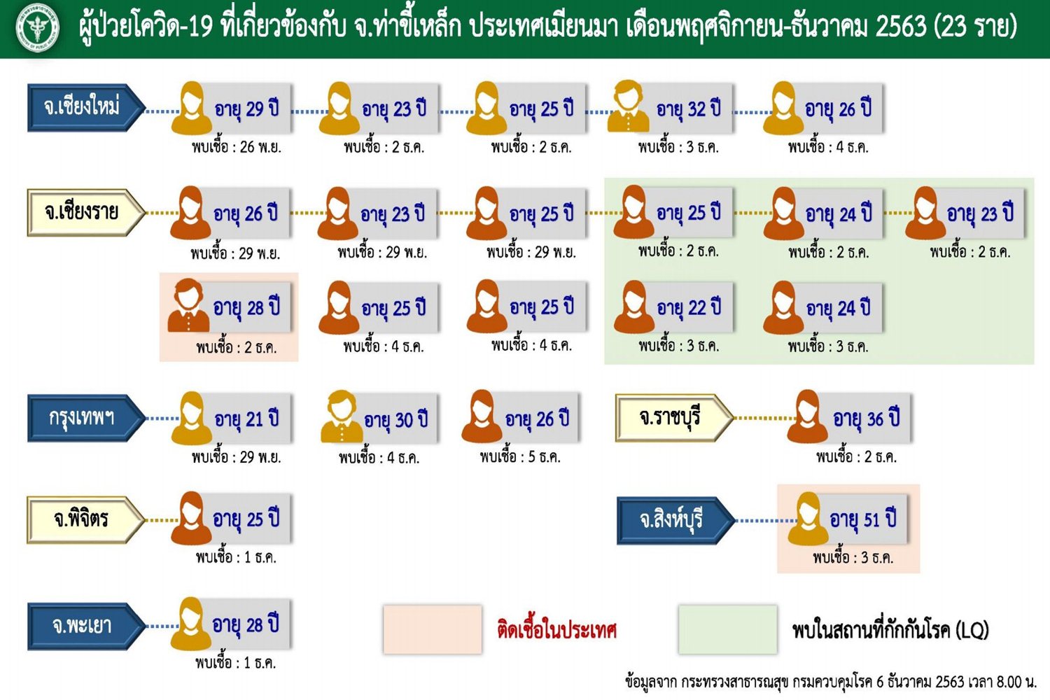 ขณะที่จ.พิจิตร พบผู้ป่วยรายเดียว ผู้สัมผัสตรวจได้ครบ ไม่พบการติดเชื้อ จ.ราชบุรี ที่พบผู้ติดเชื้อเดินทางมาจากท่าขี้เหล็ก การควบคุมโรคยังเป็นไปด้วยดี ไม่พบผู้ติดเชื้อเพิ่ม ถือว่าสถานการณ์อยู่ภายใต้การควบคุม ส่วนจ.สิงห์บุรี พบ 1 ราย ถือว่าอยู่ในภาวะควบคุมโรคได้ เพราะได้ตรวจผู้สัมผัสทุกคนผลออกมาเป็นลบ และรอตรวจผลครั้งที่สองต่อไปในอีก 7 วัน ก็ถือว่าสถานการณ์อยู่ภายใต้การควบคุม