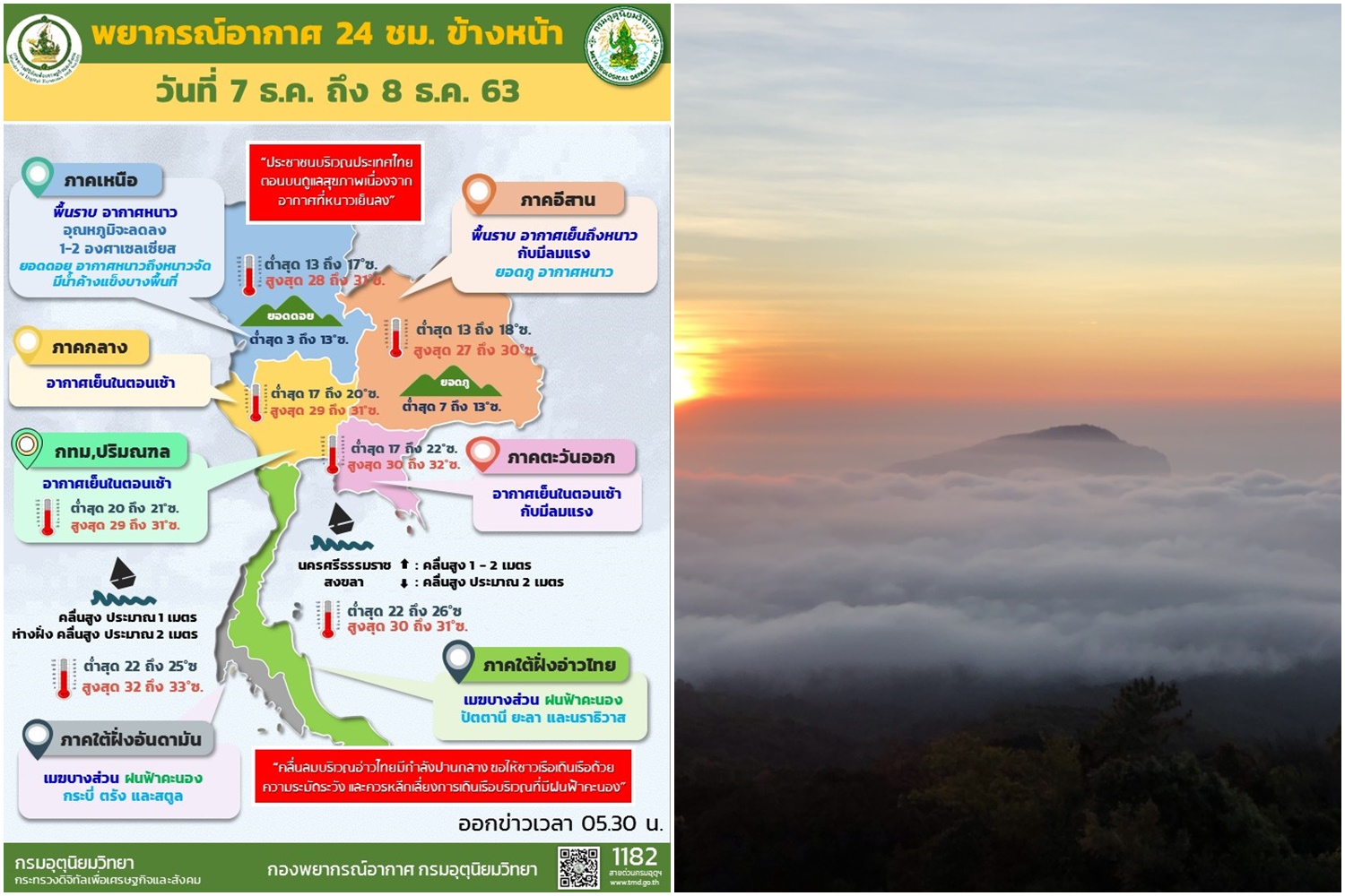 เมื่อวันที่ 7 ธ.ค. 63 กรมอุตุนิยมวิทยารายงาน ลักษณะอากาศทั่วไป ว่า พยากรณ์อากาศ 24 ชั่วโมงข้างหน้า บริเวณความกดอากาศสูงหรือมวลอากาศเย็นกำลังค่อนข้างแรงปกคลุมประเทศไทยตอนบน ทำให้บริเวณดังกล่าวมีอากาศเย็นถึงหนาวและมีลมแรง ในขณะที่ลมตะวันตกพัดพาความหนาวเย็นจากประเทศเมียนมาปกคลุมบริเวณภาคเหนือ ลักษณะเช่นนี้ทำให้บริเวณดังกล่าวมีอากาศหนาวและอุณหภูมิจะลดลงอีก 1-2 องศาเซลเซียส ส่วนบริเวณยอดดอยและยอดภูมีอากาศหนาวถึงหนาวจัดกับมีน้ำค้างแข็งบางพื้นที่ ขอให้ประชาชนบริเวณดังกล่าว ดูแลสุขภาพเนื่องจากสภาพอากาศที่หนาวเย็นลงไว้ด้วย