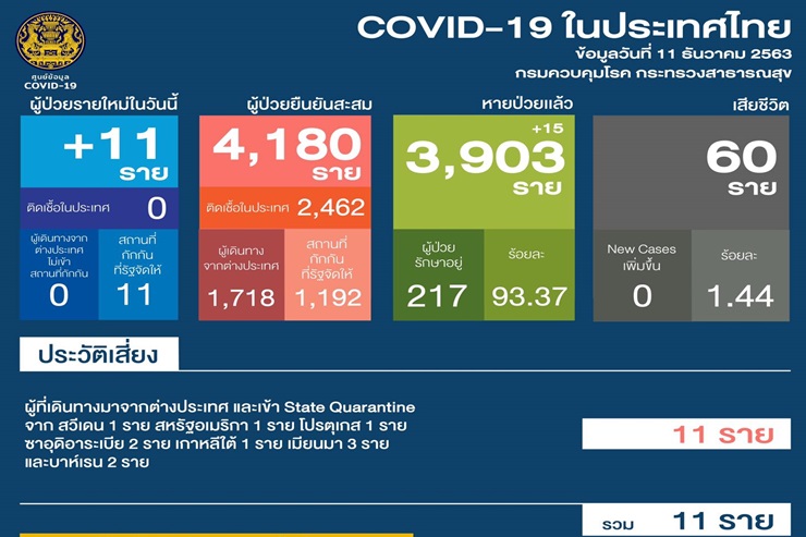 เมื่อวันที่ 11 ธ.ค. 63 ศูนย์บริหารสถานการณ์โควิด-19 (ศบค.) รายงานสถานการณ์การแพร่ระบาดของไวรัสโควิด-19 ในประเทศประจำวันดังนี้