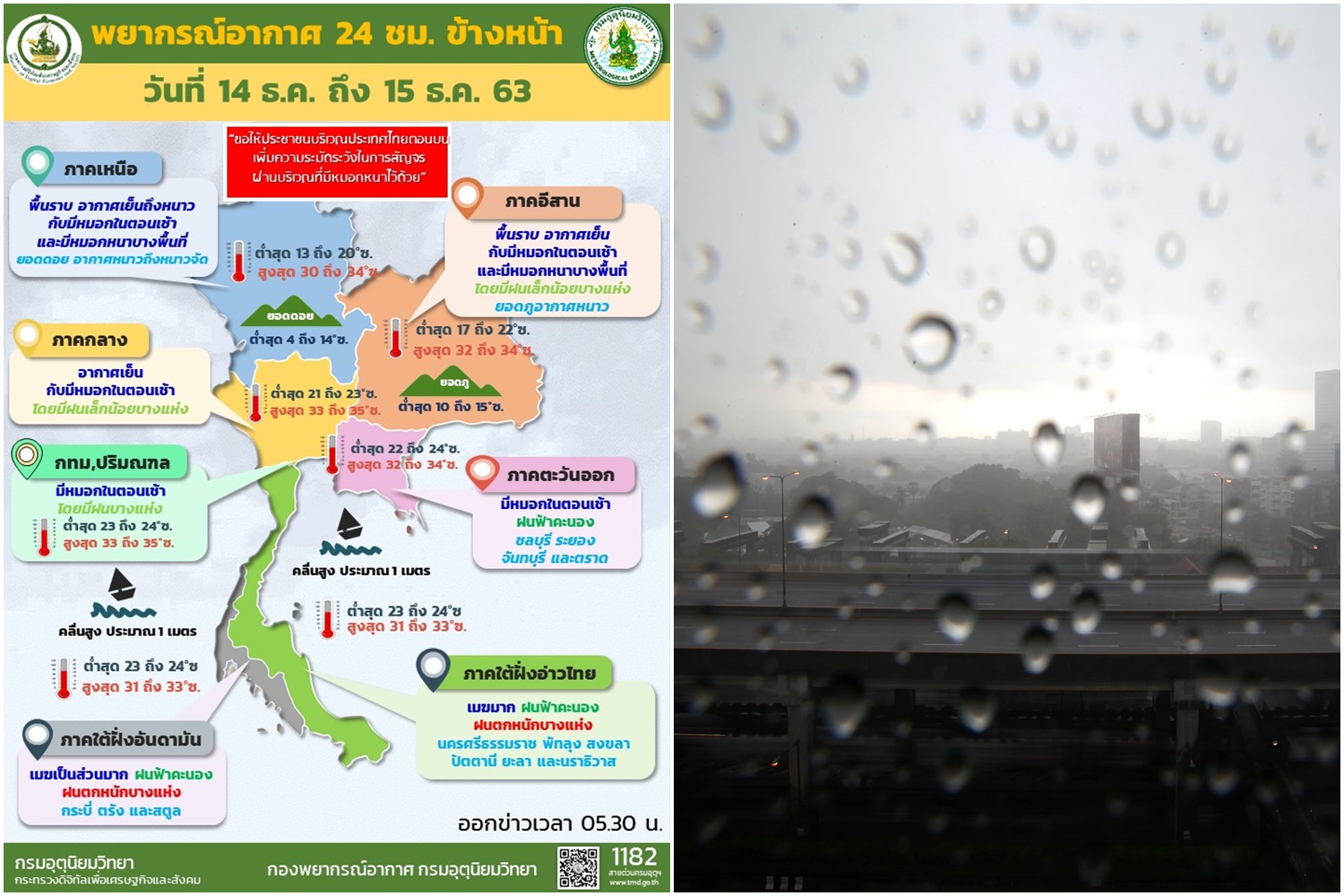 เมื่อวันที่ 14 ธ.ค. 63 กรมอุตุนิยมวิทยารายงาน ลักษณะอากาศทั่วไปว่า พยากรณ์อากาศ 24 ชั่วโมงข้างหน้า บริเวณความกดอากาศสูงหรือมวลอากาศเย็นกำลังอ่อนปกคลุมประเทศไทยตอนบนและทะเลจีนใต้ ทำให้ประเทศไทยตอนบนมีหมอกในตอนเช้ากับมีหมอกหนาในบางพื้นที่และมีอากาศเย็นถึงหนาวในภาคเหนือ ส่วนยอดดอยมีอากาศหนาวถึงหนาวจัด โดยมีฝนบางแห่งบริเวณภาคตะวันออกเฉียงเหนือตอนล่าง ภาคกลาง และภาคตะวันออก