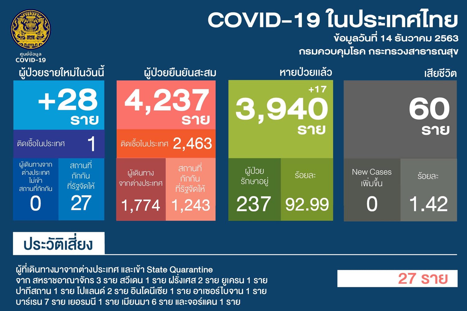 เมื่อวันที่ 14 ธ.ค. 63 ศูนย์บริหารสถานการณ์โควิด-19 (ศบค.) รายงานสถานการณ์การแพร่ระบาดของไวรัสโควิด-19 ในประเทศประจำวันดังนี้
