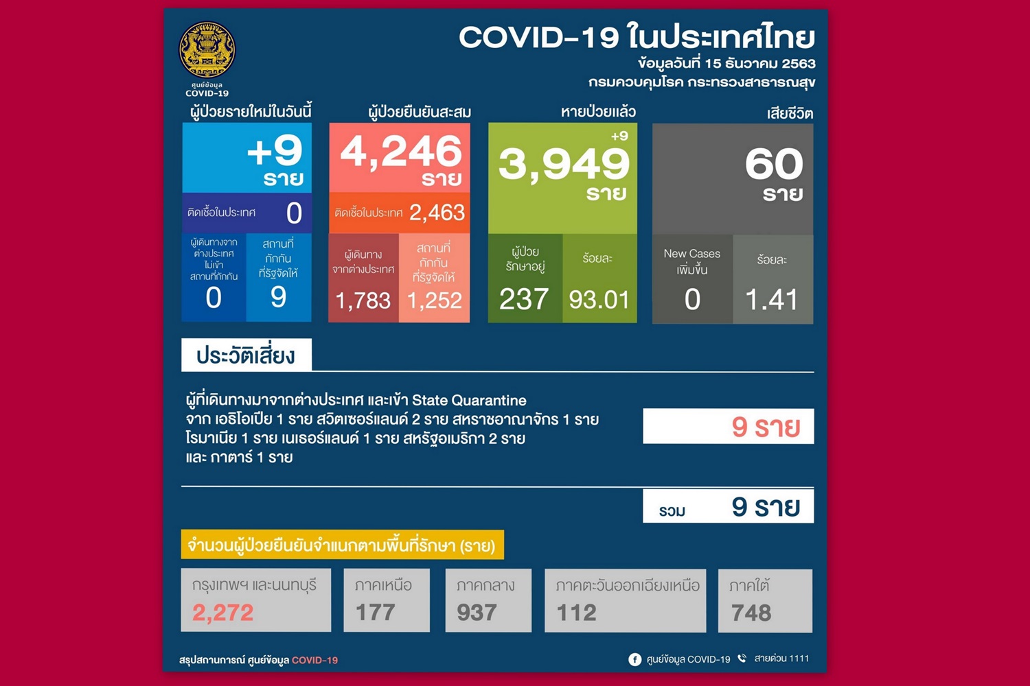 เมื่อวันที่ 15 ธ.ค.63 ศูนย์บริหารสถานการณ์โควิด-19 (ศบค.) รายงานสถานการณ์การแพร่ระบาดของไวรัสโควิด-19 ในประเทศวันนี้ว่า พบผู้ป่วยยืนยันติดเชื้อรายใหม่เพิ่ม 9 ราย เป็นผู้เดินทางมาจากต่างประเทศและเข้าสถานกักกัน (State Quarantine) 9 ราย โดยประกอบด้วย เอธิโอเปีย 1 ราย สวิตเซอร์แลนด์ 2 ราย สหราชอาณาจักร 1 ราย โรมาเนีย 1 ราย เนเธอร์แลนด์ 1 ราย สหรัฐอเมริกา 2 ราย และกาตาร์ 1 ราย