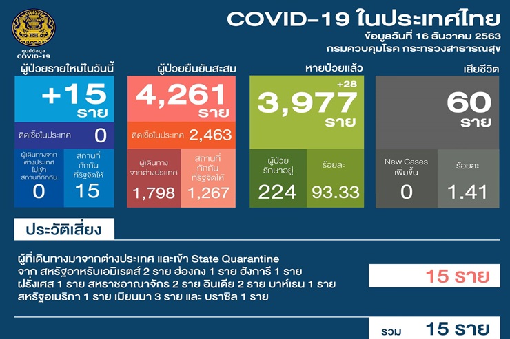 เมื่อวันที่ 16 ธ.ค. 63 ศูนย์บริหารสถานการณ์โควิด-19 (ศบค.) รายงานสถานการณ์การแพร่ระบาดของไวรัสโควิด-19 ในประเทศประจำวันดังนี้